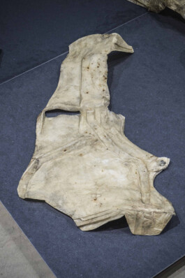 Museum has a rare collection of these original paper moulds and their plaster casts made by Maudslay from the Mayan monuments of Guatemala and Mexico [... ]. These paper moulds were never meant to endure, they were ephemeral transmitters... However, the moulds together with the plaster casts made from them bear the physical imprints of the objects they touched, transmitting not only the shapes of the monuments but also their flaws, traces of their makers and the places where they were made. In some cases, they carry the metadata for monuments that in their original form have deteriorated and become illegible. Today, practitioners of Digital Humanities use metadata sources like these to construct digital versions of the original built structures. This technique is not only of interest for researchers but also for contemporary artists, such as Nicola Lorini. His work investigates how objects and narratives from the past travel and mutate their conditions. In Hotèl Culny, he has adapted the paper mould technique of Lottinoplastique to instigate a dialogue between material production and the interpretation rand transmission of information through paper. The paper mould technique also informs the subject matter of his work: his ephemeral sculptures are taken, not from ancient monuments, but from the vans used by museums for art transport.